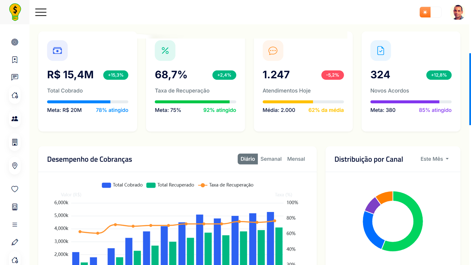 Visualização em tempo real do desempenho das cobranças, com métricas e KPIs personalizáveis.